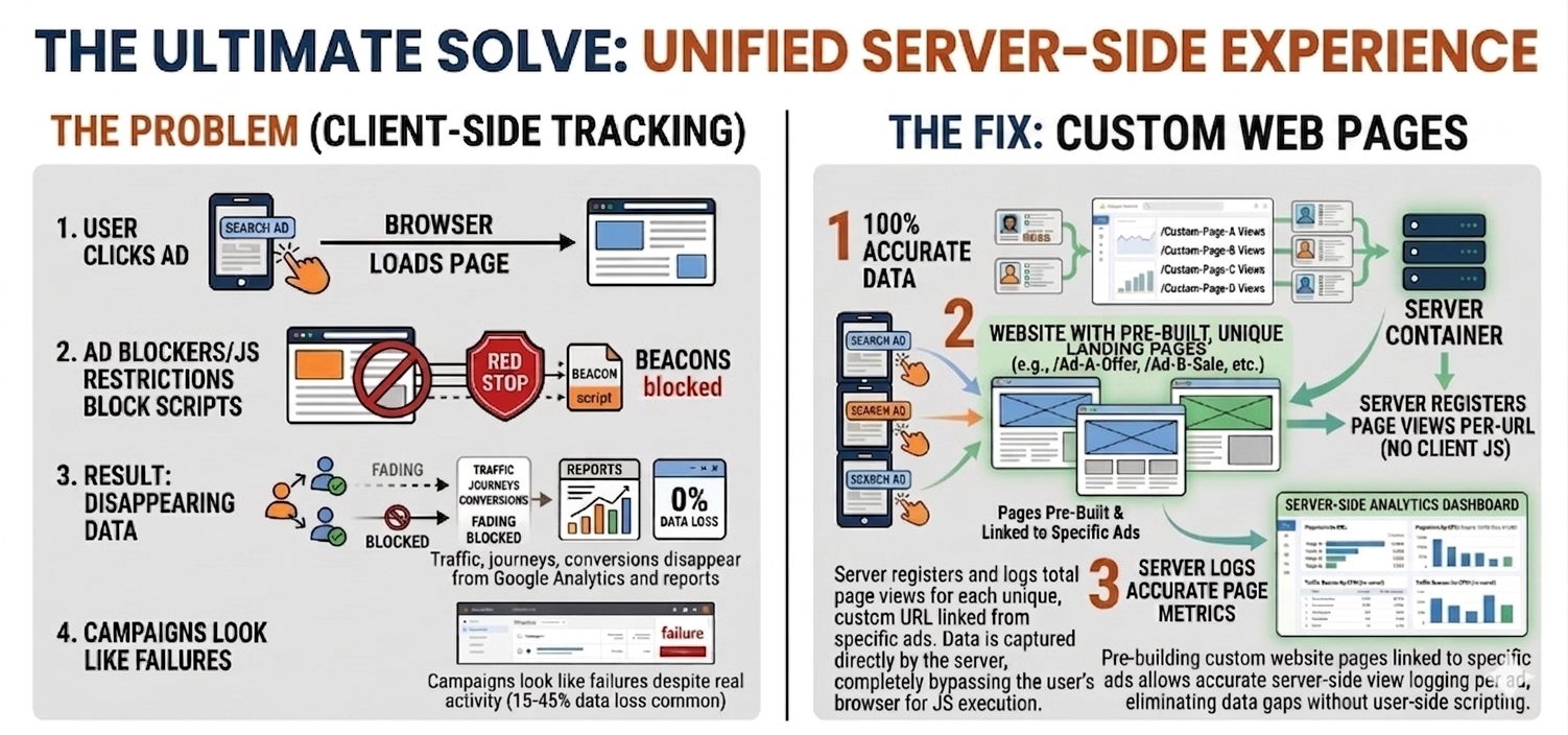 - Data Flow Failure. Because this mission-critical logic is executing in the client browser, it is **100% visible to and blockable by ad blockers and privacy tools** (Step 2 of the infographic). They stop the dynamic JS. The user lands, and the JS fails. The user sees a generic page (UX failure) and you lose the data (Tracking failure, Step 3).