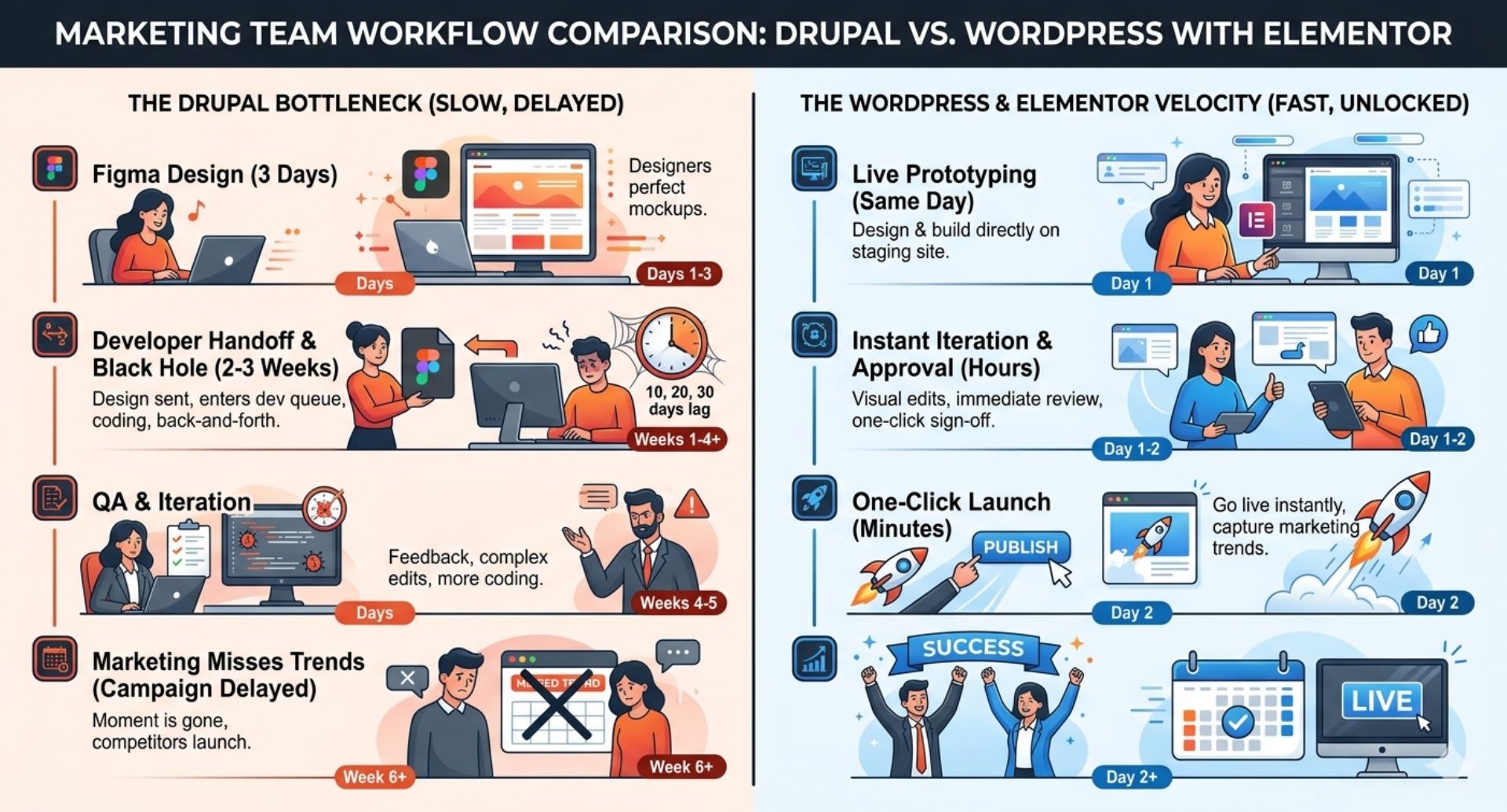 When you are paying for every click, every second of delay and every bit of generic content costs you money. In a rigid Drupal environment, marketers often settle for sending ad traffic to a general page because creating a custom, high-converting landing page takes too long. With WordPress and Elementor, you can build specific, laser-targeted landing pages for every campaign in a fraction of the time.